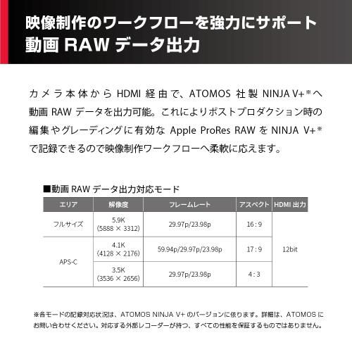 - 柔軟な映像編集を可能にするV-Log撮影 と、よりハイレベルな映像制作を実現する動画RAWデータ出力が可能