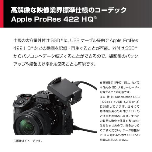 - 高品質・低圧縮のApple ProRes 422 HQや4:2:2 10bit All-Intraのファイルサイズの大きい動画データを、最大2TBの外付けSSDへS5M2Xからダイレクトに記録が可能