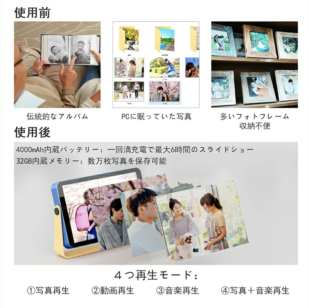 「2.4GHz帯」Wi-Fiを使用し、携帯電話やタブレット(iOS・Androidに対応)に無料の専用アプリをインストールすれば、写真や動画をデジタルフォトフレームにアップすることで、離れている恋人、家族にもリアルタイムに共有できます。【地域の制限はありません】